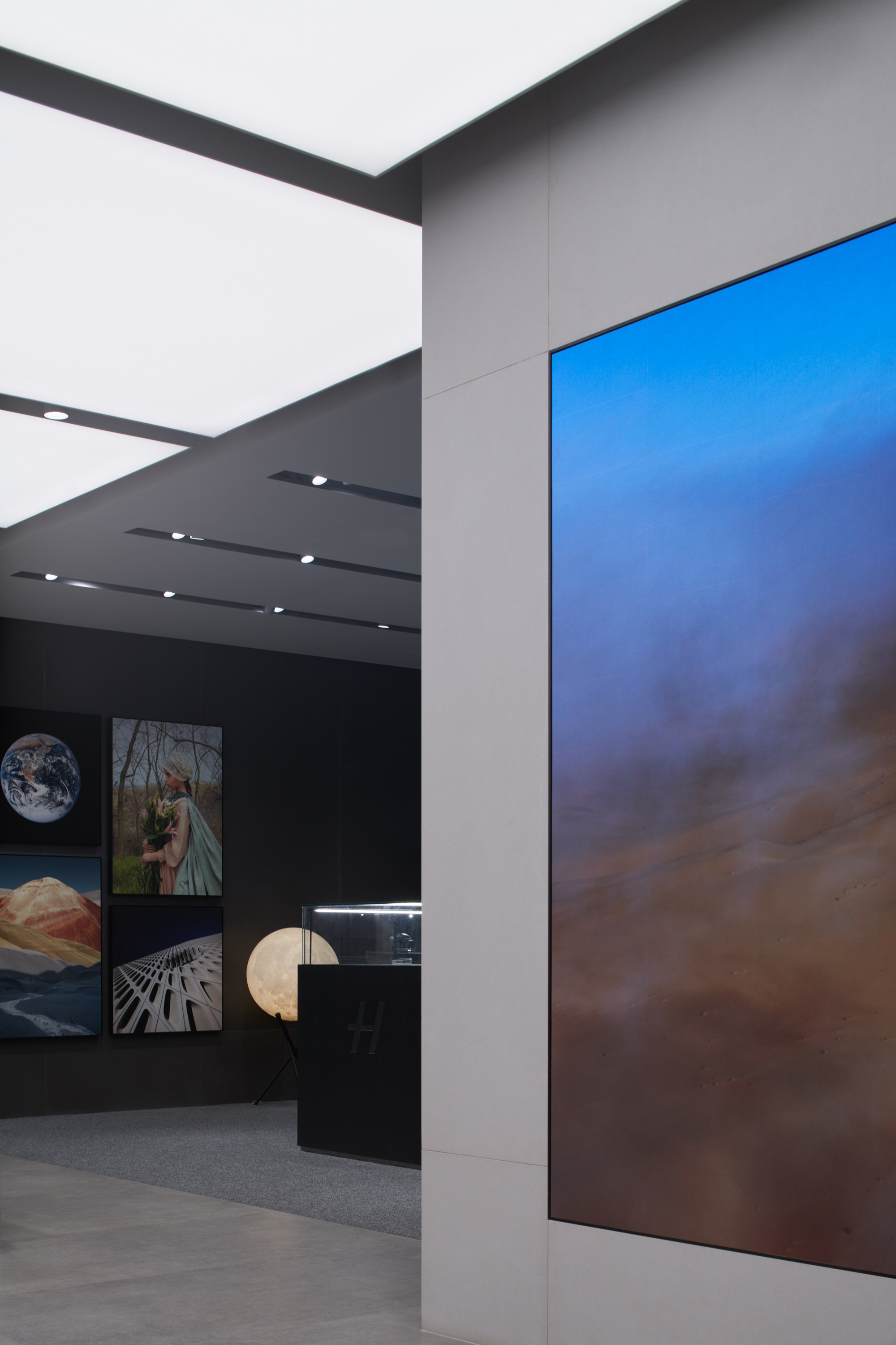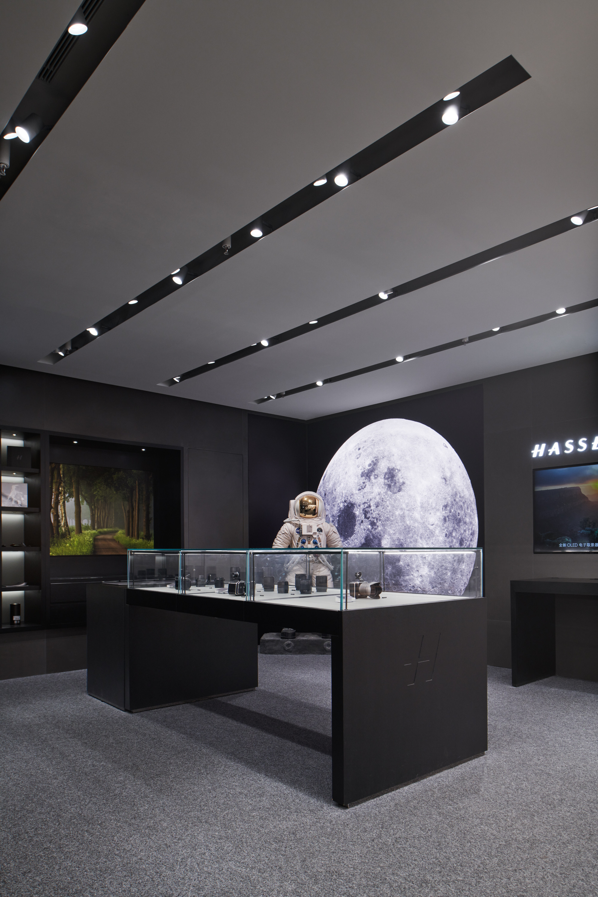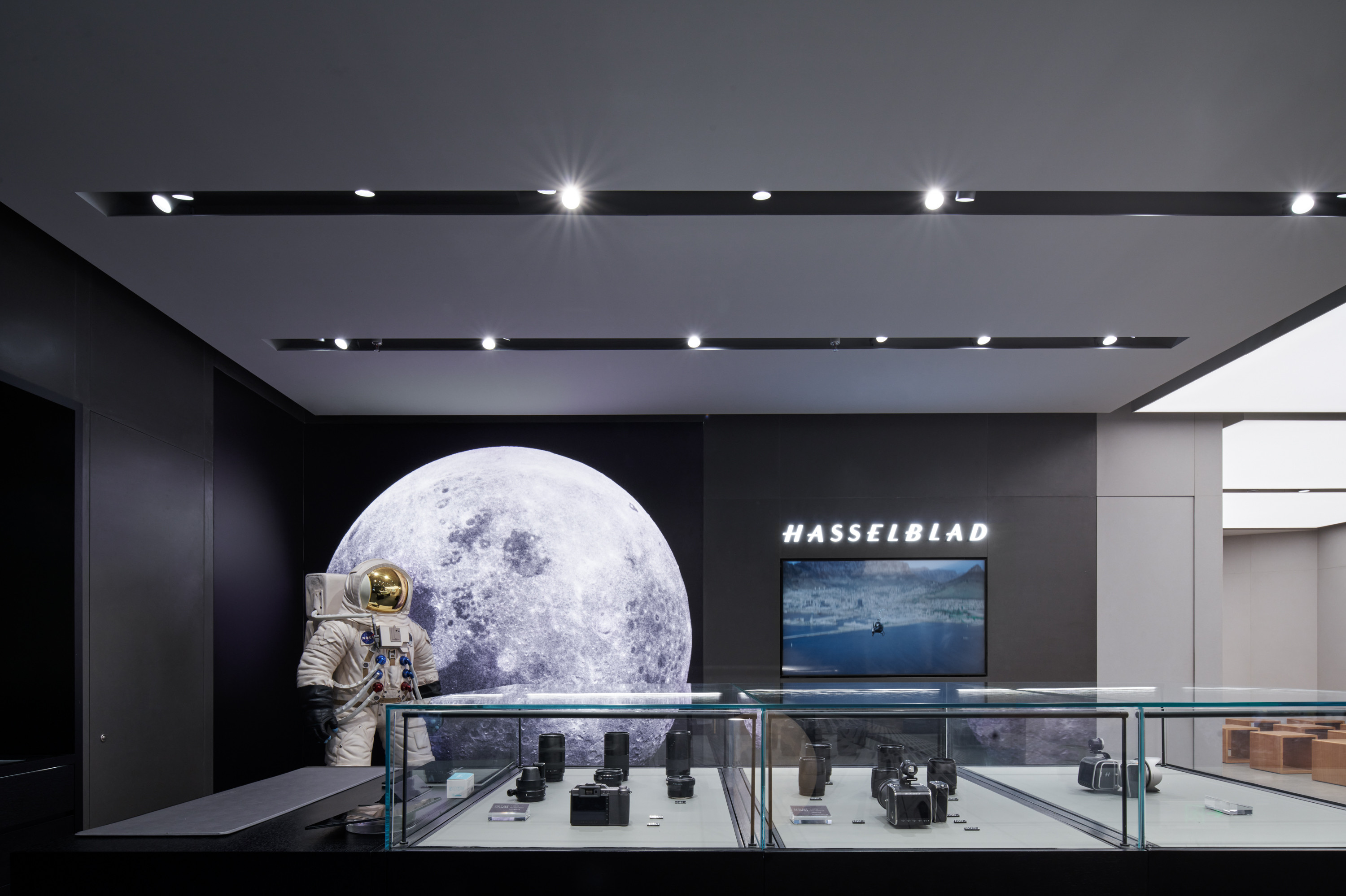 DJI&HASSELBLAD概念店SI的形象开发难点在于在两个品牌属性中寻找平衡点:“代表未来的大疆创新”和“代表永恒经典的哈苏相机”,在同一零售场景中品牌的融合与区分。